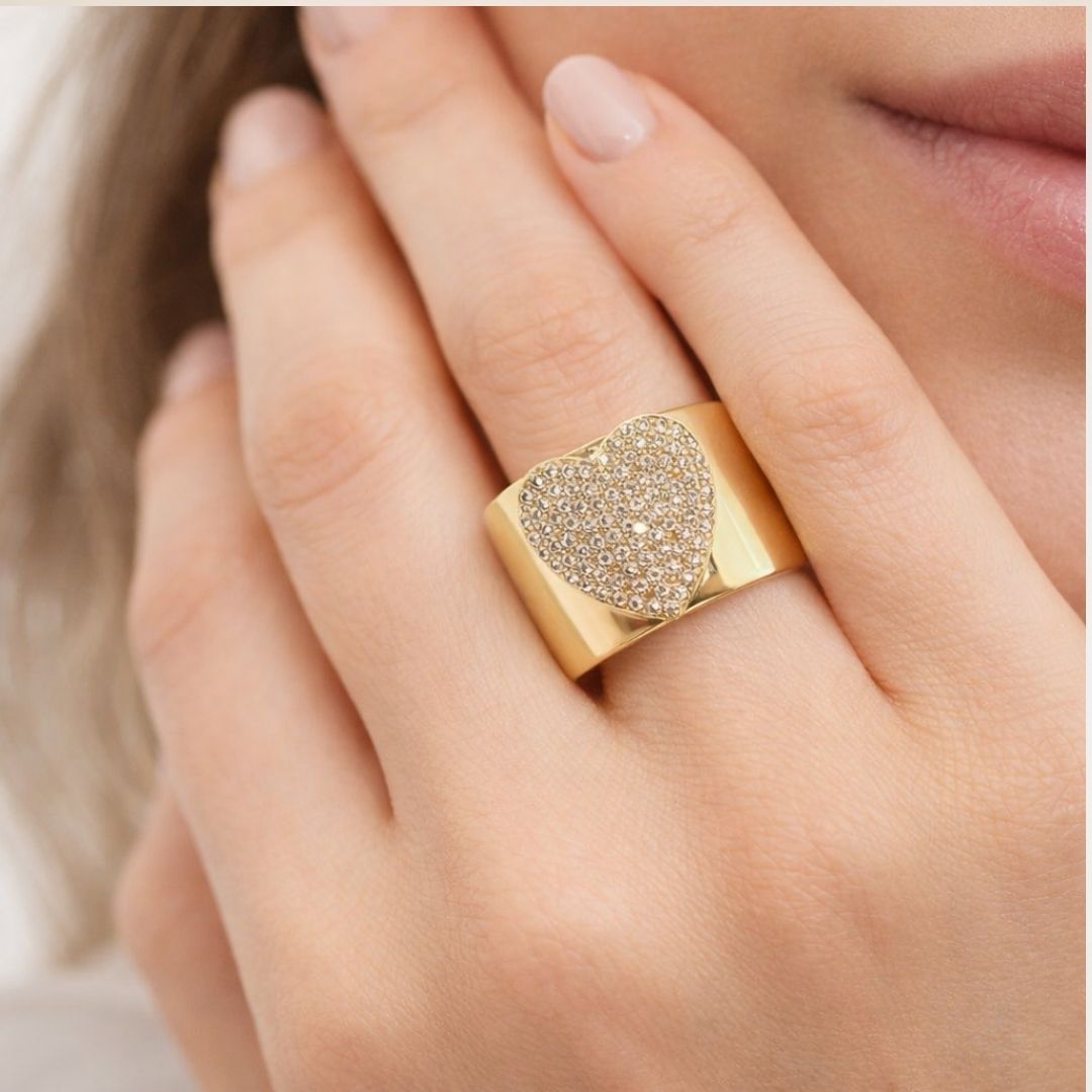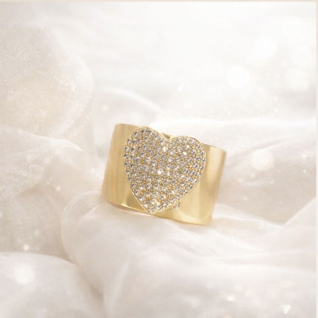 Anel ouro 18K grosso com coração no centro cravejado de zircônias