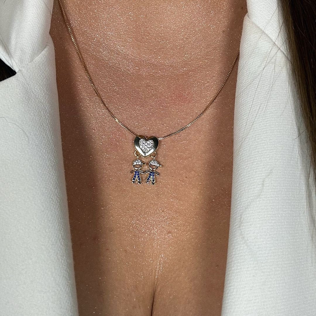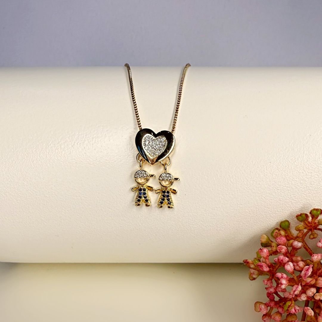 Colar ouro 18K de coração cravejado no centro e pingente de filhos