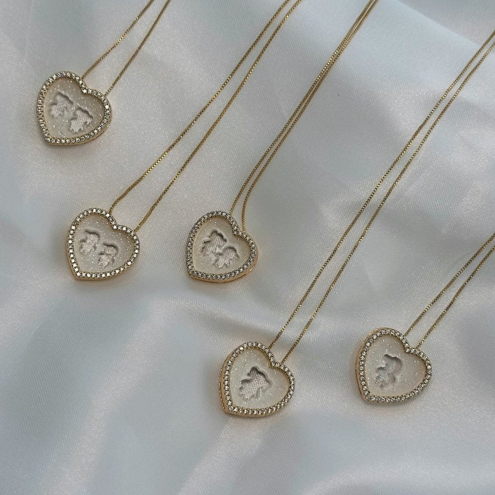 - de coração de madrepérola e cravejado de zircônias em volta,