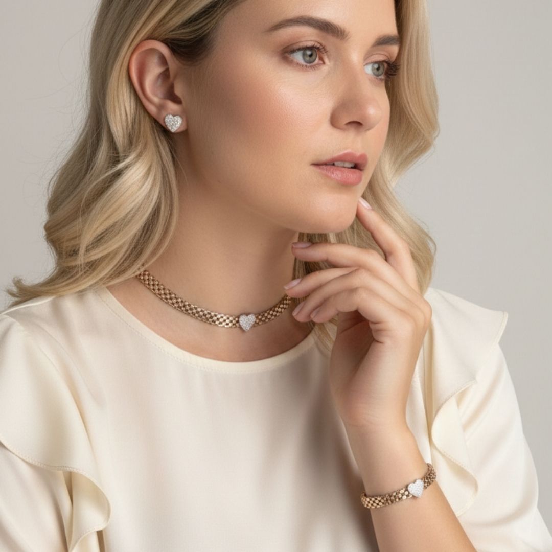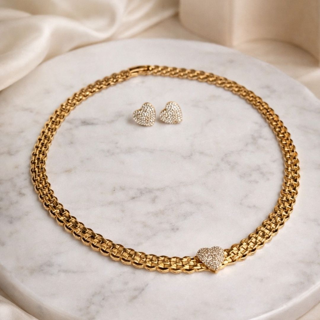 • Brinco e colar com coração Cravejado