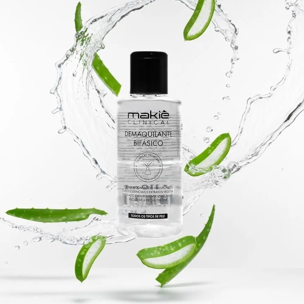 O Demaquilante Bifásico Makiê remove desde maquiagens normais até  maquiagens à prova d 'água da área dos olhos, lábios e rosto. Potente e desenvolvido com novas tecnologias, ele é capaz de dissolver pigmentos concentrados sem irritar ou causar ardência e sem agredir a derma. O resultado é uma pele suave, graças aos seus ativos de efeito calmante. Aliado à rotina skincare, ele ajuda a circulação e a melhorar o tônus, além de dar uma sensação de agradável frescor devido à sua fórmula com matérias primas naturais, componentes vegetais e potencial silicone DC 245 dermatológico. Hidratante efetivo, o Demaquilante Bifásico Makiê tem fórmula enriquecida com Ácido Hialurônico, eficiente condutor do colágeno, que suaviza linhas de expressão e produz um suave efeito lifting.